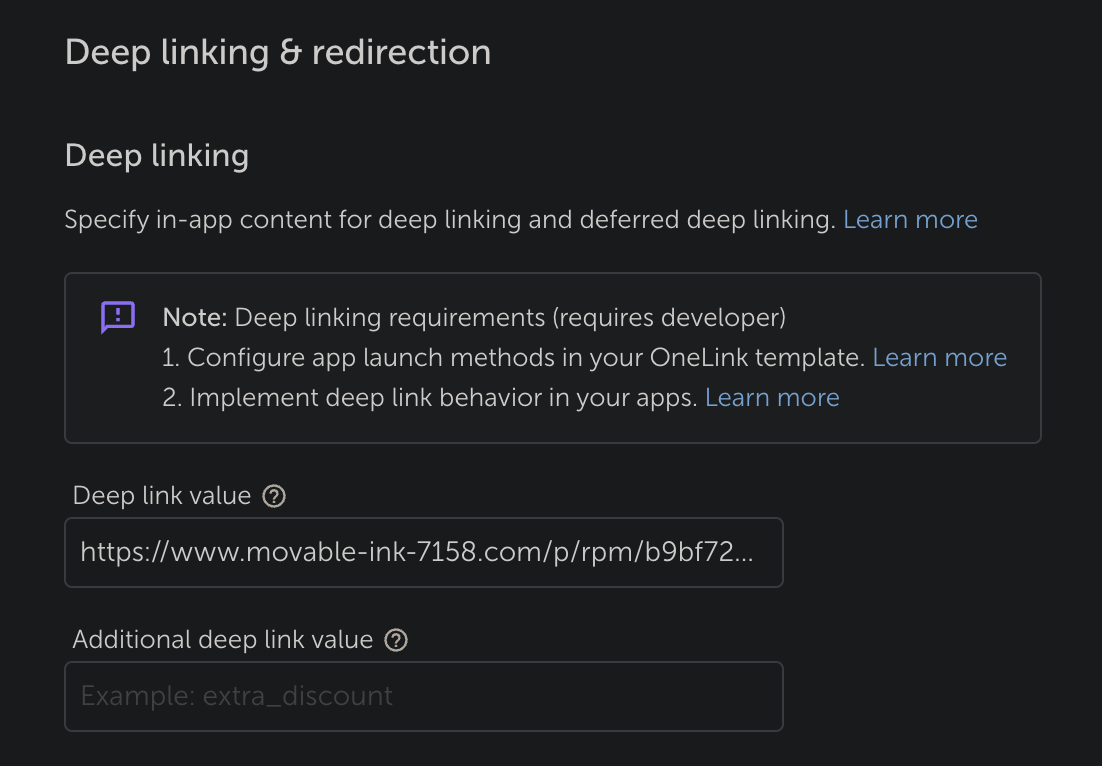 If you use AppsFlyer for deeplinking, and would like to use an MI Link as the deeplink value for a OneLink, you can do that! You'll just need to ask the MovableInk SDK to handle the url after AppsFlyer has unwrapped the OneLink.